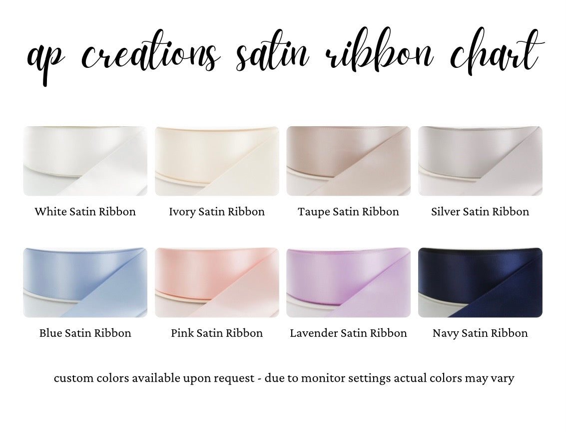 • Blue Linen with Splendor Font in White Thread with White Satin 4 inch Knot