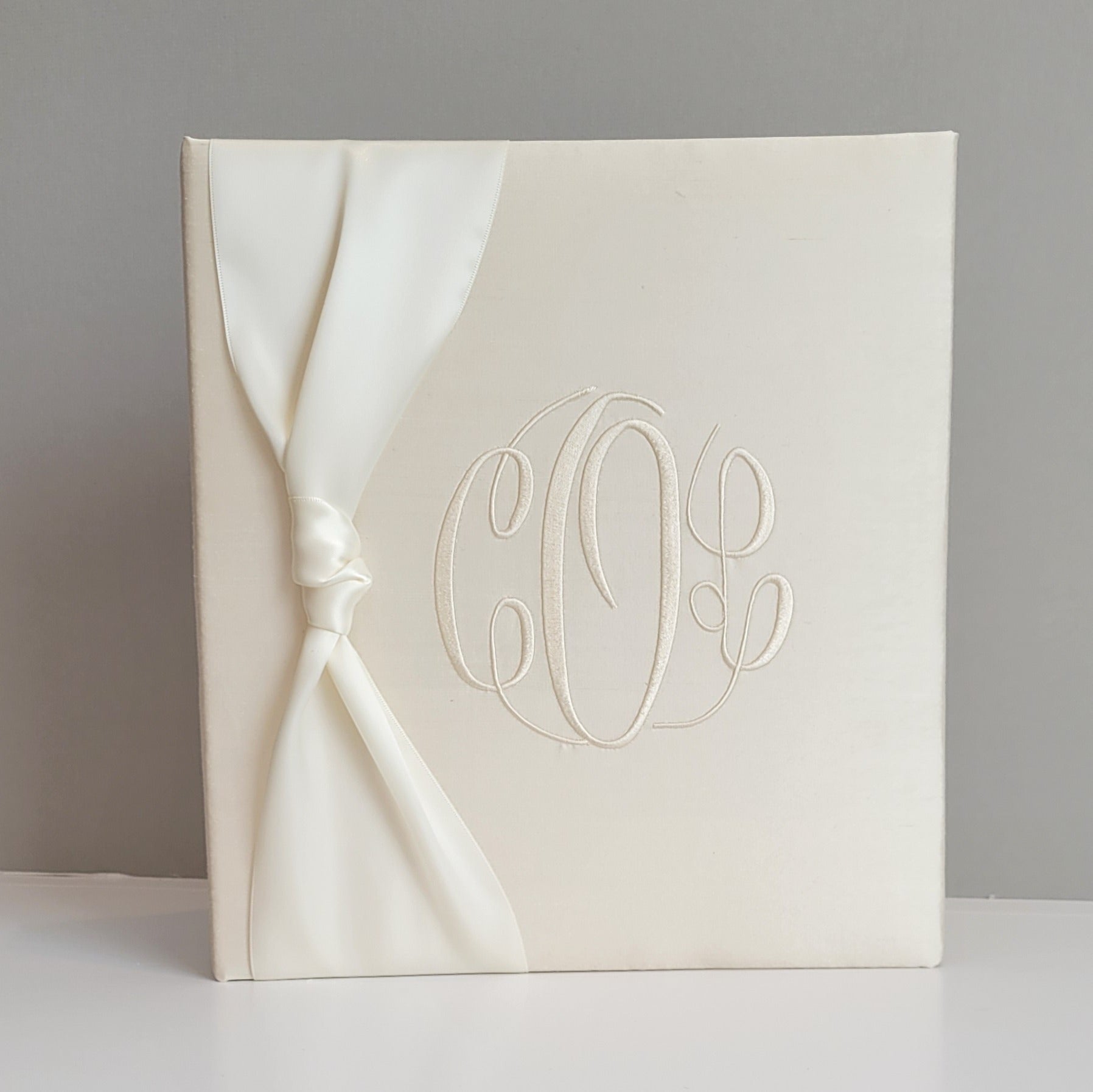 • Ecru Silk with Fancy Font in Ivory Thread with a 4 inch Ivory Satin Knot