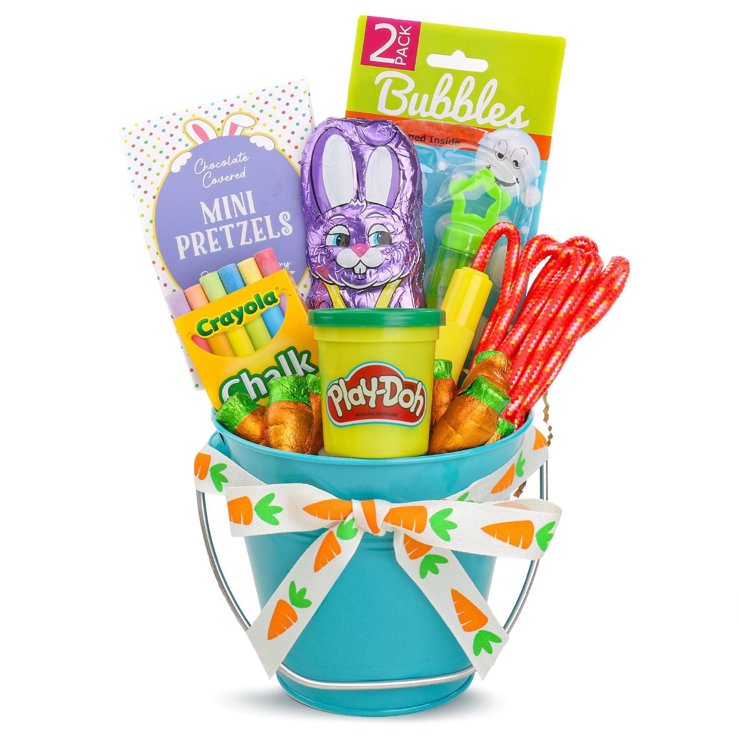 Contents: Chocolate Easter Bunny (1.5oz.), Mini Chocolate Pretzels (2oz.), Chocolate Foil Wrapped Carrots, Crayola Chalk (12ct.), Non-Toxic Bubbles with Wand (2pk), Play-Doh Assorted Colors, 6ft. Jump Rope, Metal Pail with handle