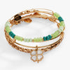 Manifest positive vibes and good fortune with this set of three charm bangles on expandable wire bangle bracelets. One has a four-leaf clover charm embellished with genuine Mother of Pearl, one is a beaded bangle with gradient shades of green and gold-tone beads, and one is a twisted metal accent bangle. Wear it as a reminder that you make your own luck.