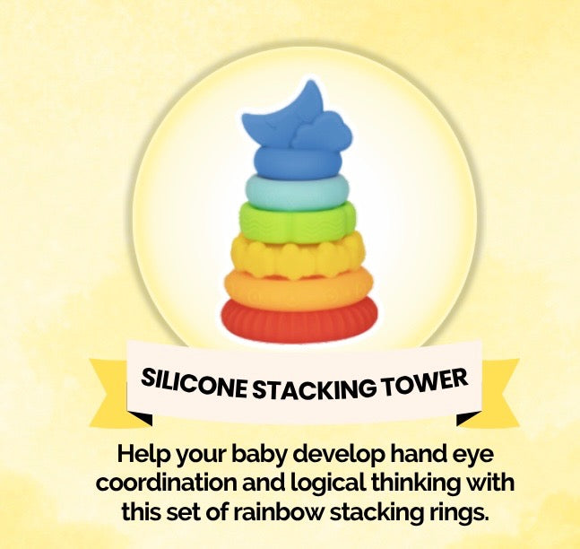 Educational box for babies aged 5-6 months, full of developmental items to aid baby in their cognitive growth. Each box comes with 6 products, all products are made from sustainable and safe material. These boxes encourage open ended play while helping to strength fine motor skills.